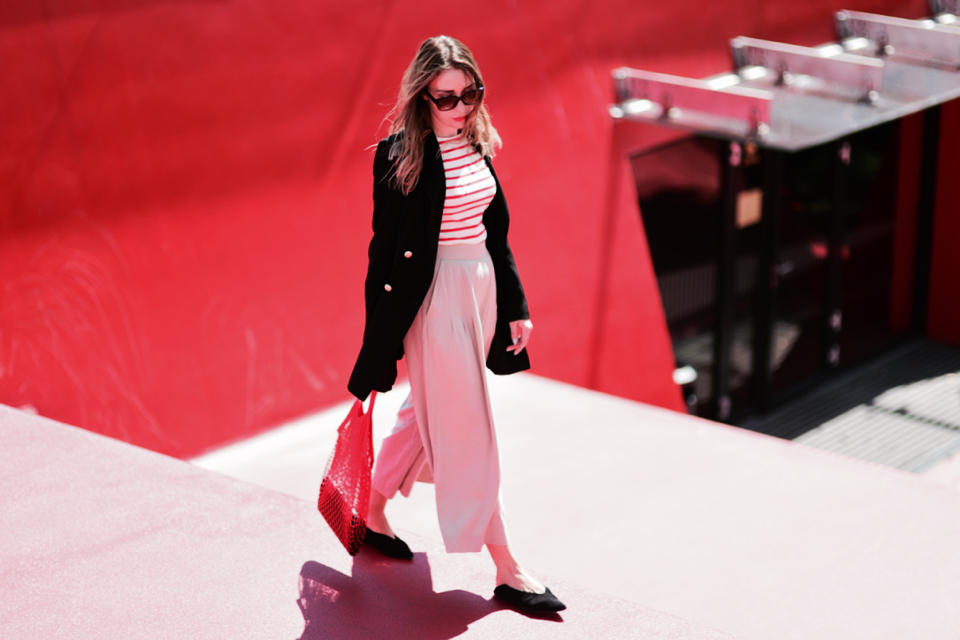 beżowe-kuloty-bluzka-w-paski-czarna-marynarka-ze-złotymi-guzikami-torba-pleciona-ze-sznurków-stylizacja