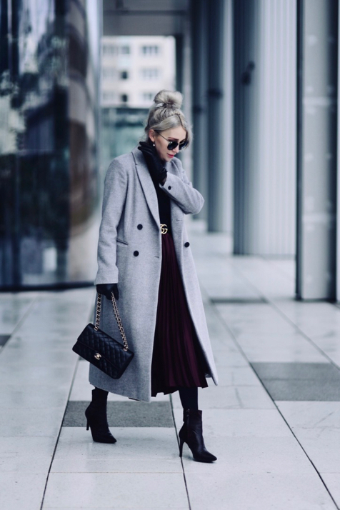 jakie-buty-do-plisowanej-spódnicy-stylizacja-torebka-chanel-flap-bag-medium-caviar-pasek-gucci-plisowana-spódnica-szary-płaszcz-stylizacja - Shiny Syl blog